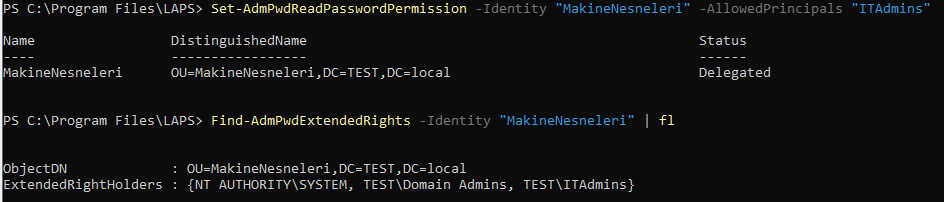 Set-AdmPwdReadPasswordPermission -Identity "MakineNesneleri" -AllowedPrincipals "ITAdmins"