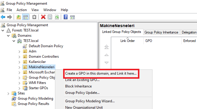 Yukarıdaki örnekte, “ MakineNesneleri” tüm makine nesneleri için oluşturduğum OU'dur.