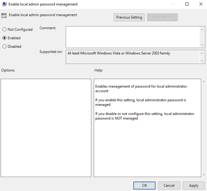 “Enable local admin password management” üzerine çift tıklayın. Ardından Enabled üzerine tıklayın ve ayarları uygulamak için OK üzerine tıklayın . Bu, parola yönetimi özelliğini etkinleştirecektir