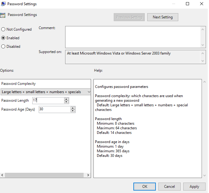 Daha sonra “Password Settings ” üzerine çift tıklayın. Burada parola karmaşıklığı ayarlarını ve parola yaşını tanımlayabiliriz. Tüm ayarlar yapıldıktan sonra OK üzerine tıklayın .