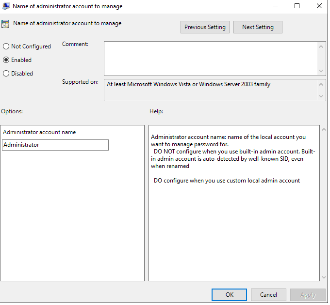 Test ortamımda, yerel yönetici hesabı “administrator”dir. LAPS ile yönetmek için bu hesabın parolasına ihtiyacım var. Bunu yapılandırmak için, “Name of administrator account to manage” tıklayın.