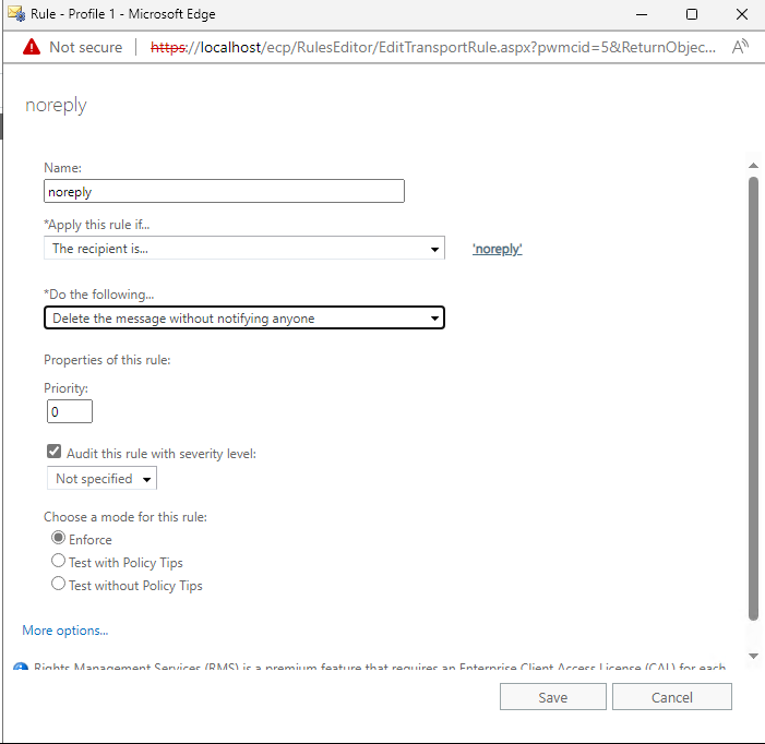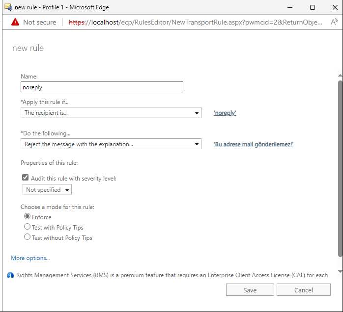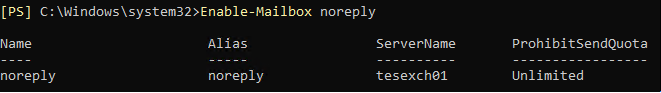 Noreply@domain.local kullanıcısı oluşturulur. Exchange management shell açılır. Aşağıdaki komut girilerek kullanıcının email adresi oluşturulur.